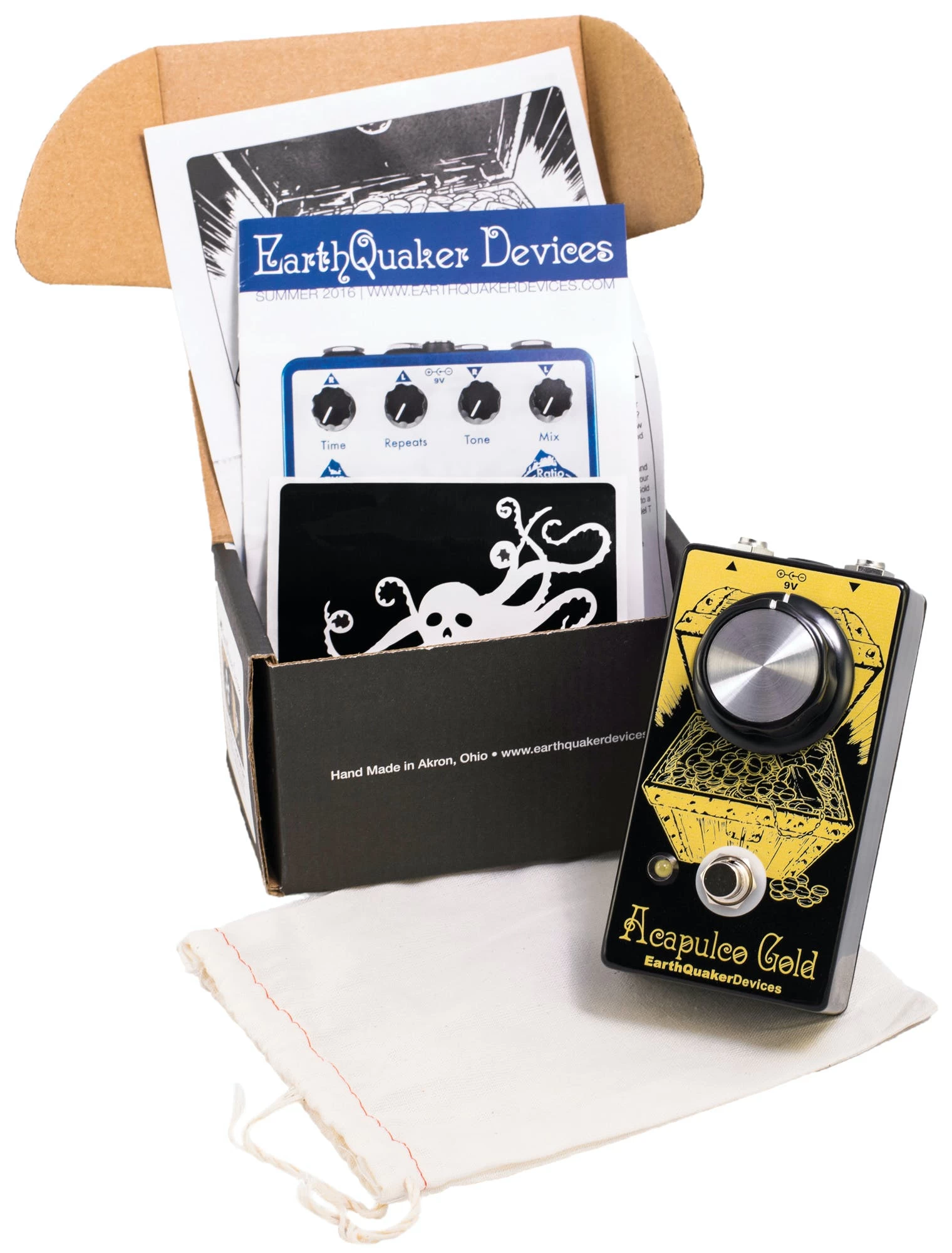 The Acapulco Gold is all-analog, true bypass, and built one-at-a-time by a wandering expedition of prospectors and speculators in dusty Akron, Ohio, USA the hamburger capital of the world.
