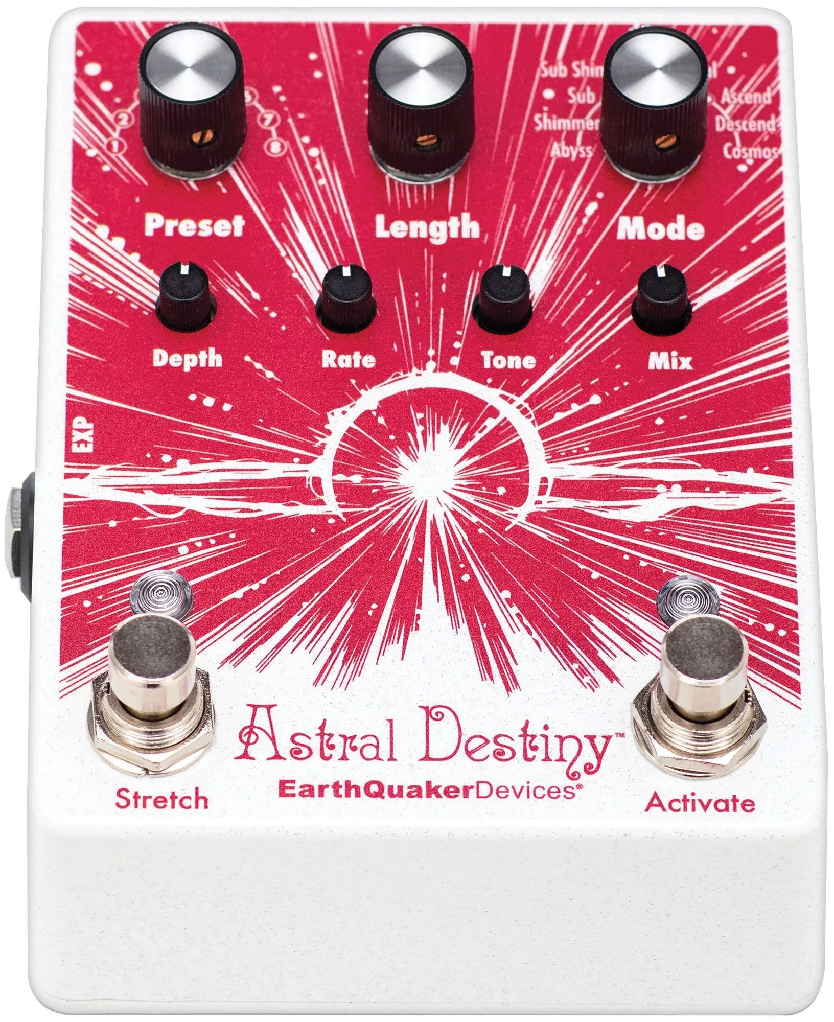 Preset Mode in contrast lets you chose from one of the 8 unearthly, ethereal factory preset reverb fates, 1 for each reverb mode, the Astral Destiny comes with. Each of these can be edited or completely overwritten just like when the ancient Fates plucked or cut the strings of ones destiny. Save settings for Length, Depth, Rate, Tone, Mix as well as EXP assignment and Stretch length and recall them instantly. Any of the Astral Destiny’s 8 reverb modes can be used as the basis for each of the 8 presets.