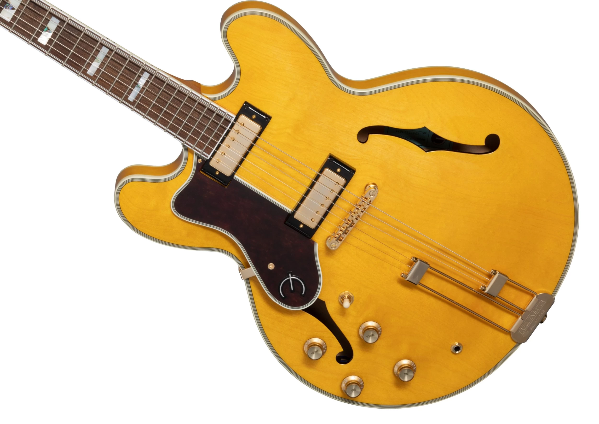 One of Epiphone’s most storied guitars, the Sheraton returns! This elegant instrument features a semi-hollow body crafted from layered Maple with a Maple centerblock for feedback resistance. The 22-fret, Mahogany neck has a bound Indian Laurel fingerboard with block mother of pearl and abalone triangle inlays. The bound headstock has a historic Epiphone logo and elegant tree of life inlay in mother of pearl.