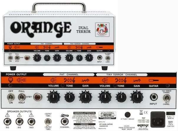 The Dual Terror is a twin channel, 30-watt head switchable from 30 to 15 or 7 watts, giving more choice and options shrunk into a size that belies its power! Since they were first released Orange amps, heads and cabs have been constantly popular with guitarists and bass players from every genre.
