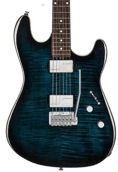 Meet the latest all-new design in the Sterling by Music Man roster: the Sabre. Its eye-catching nyatoh body and flame maple top are crafted into a comfortable, modern shape unlike any other. Loaded with locking tuners, stainless steel frets, and a modern C-shaped roasted maple neck, this guitar makes shredding feel easier than ever. Plus, with the hum-free Fishman Fluence Modern Humbucker pickups, its tone is unmatched, achieving clarity even while handling all of the gain you can throw at it. Available in Cobra Burst and Deep Blue Burst.